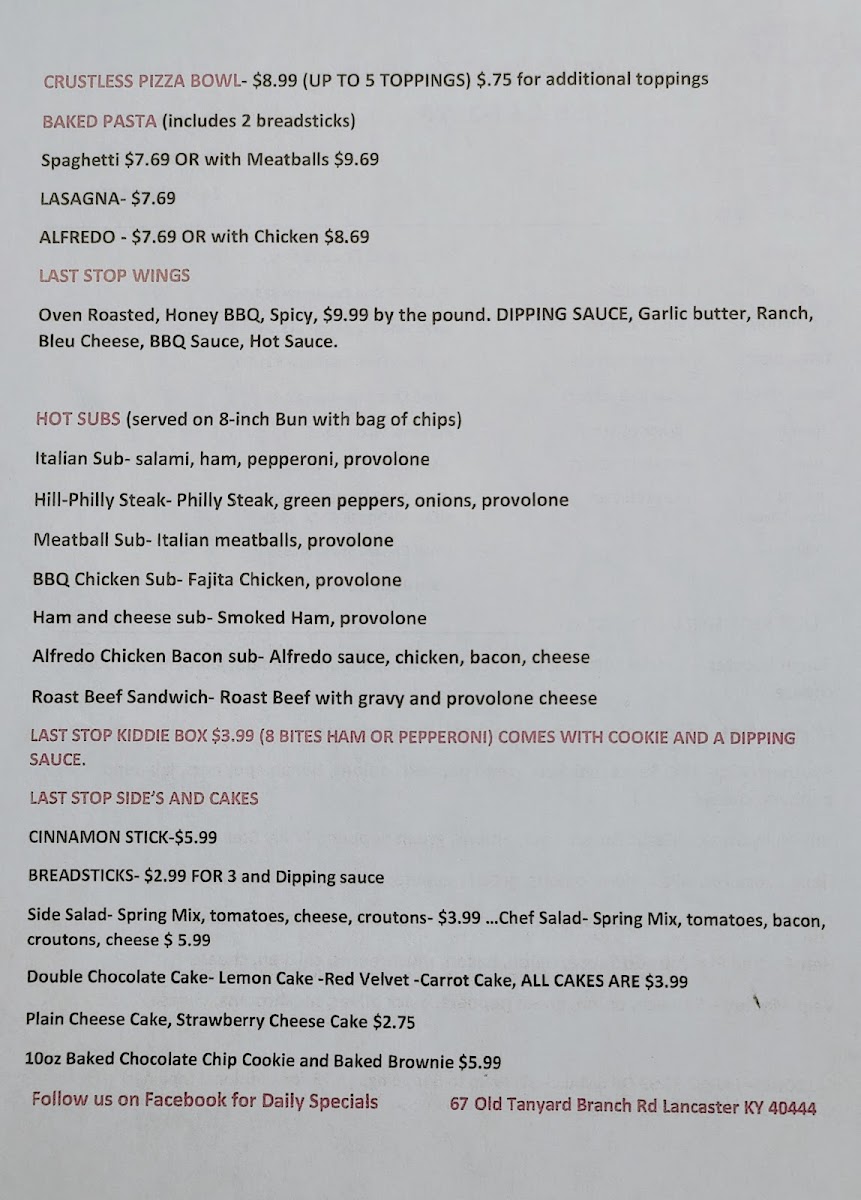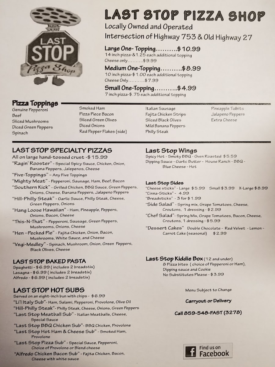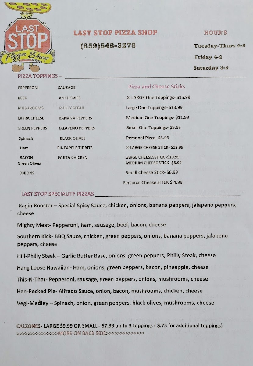 Last Stop Pizza Shop Menu